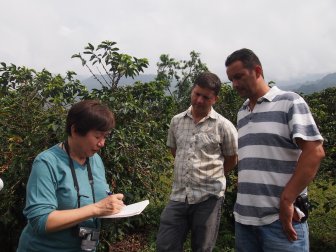 農園は斜面に面しています。木や土の状態を確認しながら見て回ります。エルサウセ農園では木の間隔を開けて、風通しをよくしています。